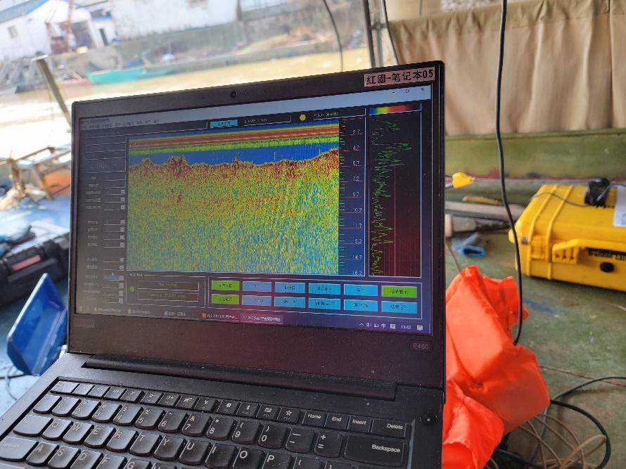 After the test preparations were completed, the equipment demonstration work began. The boat travelled along the direction of the test line at a fixed speed. After software settting-up, gain and other settings, the river bottom can be clearly seen.