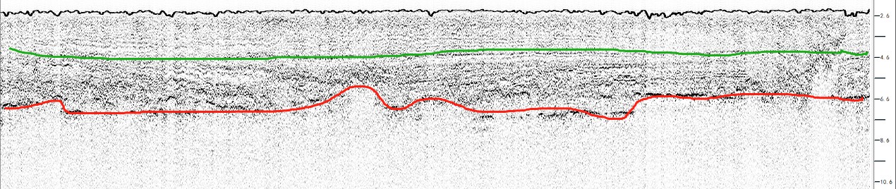 As can be seen from the above figure, the green line is the interface of the weathering layer, which is very obvious, and above the green line, it can be judged as a soft mud with high water content, whose acoustic reflection is very weak, which can be interpreted as "silt".